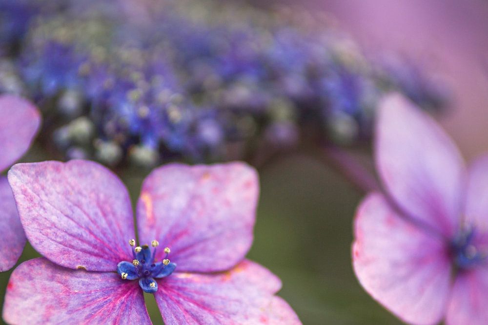 Macro shot of an umbellifer hydrangea : Hydrangea Macrophylla 'Mariessii Perfecta' or also 'Blue Wave'. The umbellifer was photographed with shallow depth of field giving a nice blurry background.