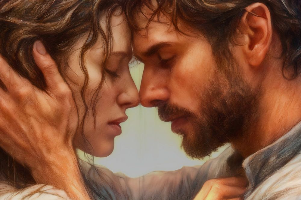The artwork shows two people holding each other tenderly, forehead to forehead, as if in a quiet moment of deep connection. Their eyes are closed, evoking a sense of trust and surrender. The texture is reminiscent of a soft, almost dreamy pencil or pastel illustration. The atmosphere is warm, calm and full of softness-as if the world stands completely still for a moment.