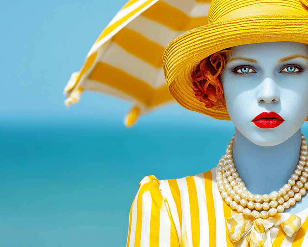 This striking beach photo shows a woman wearing a large yellow hat and striped dress. Perfect for those looking for fashionable art, summer prints and original wall decor. Add a touch of elegance and colour to your interior with this unique art photo.