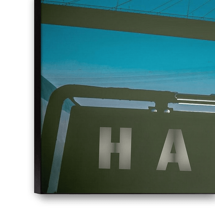 The roof of a ship with the glowing inscription Hamburg is shown gliding majestically under the iconic Köhlbrand Bridge on a calm night. The dramatic silhouette of the bridge stretches mystically across the picture, while the clear sky and soft lighting create an almost cinematic atmosphere. A moment full of maritime longing and urban strength - perfect for lovers of architecture, harbour romance and northern German atmosphere