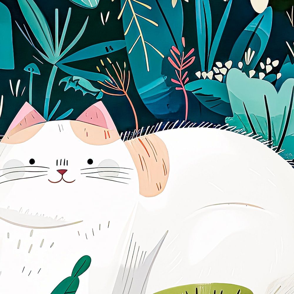 Bring nature into your home with this charming cat print wall decoration. This artwork shows an adorable white cat amidst lush, green leaves. Its vibrant and playful design makes it a perfect addition to any room, ideal for cat lovers who want to embellish their space with a touch of nature.
