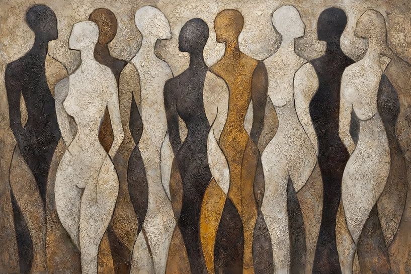 This impressive work of art captures the diversity and interconnectedness of human forms in a profound yet aesthetic manner. It depicts a series of stylised female figures standing close together in an abstract representation. Each figure is unique in its texture and shading, with the contours blending softly into one another to form a…