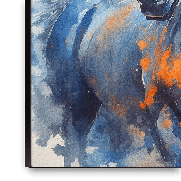An imposing horse with a flowing mane attracts everyone's attention with its bright blue and orange tones. The dynamic composition radiates energy and movement.