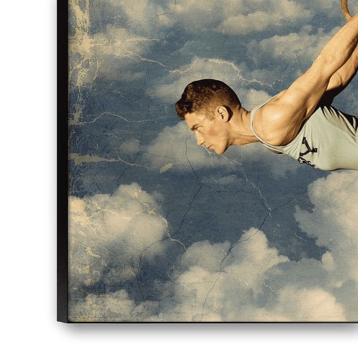 Surreal, vintage rendition of an athlete on rings, on a cloud.