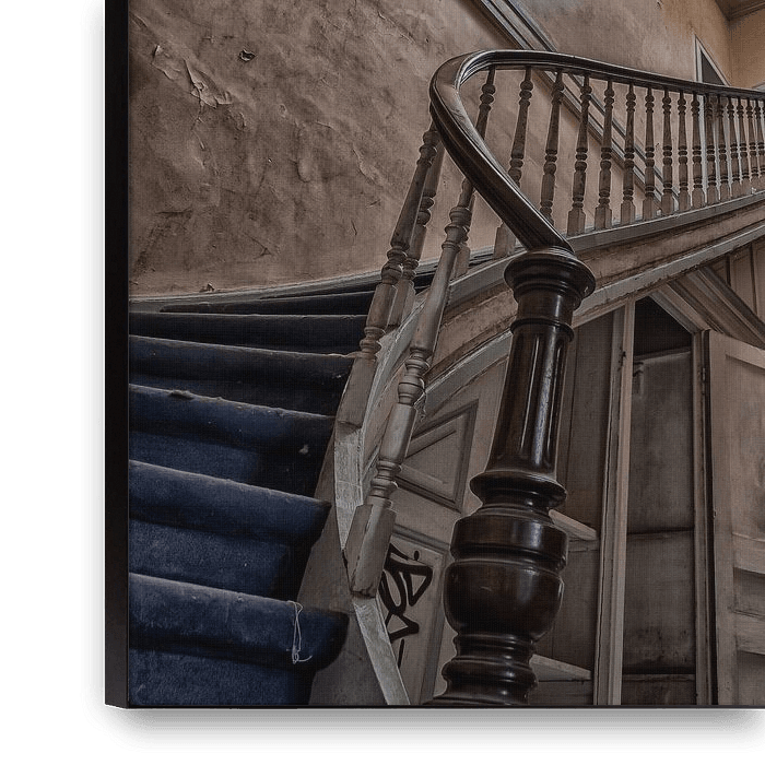 Staircase the abandoned hotel/restaurant known in the urban exploration world (urbex) as Chateau Cinderella. The building can be found in the south of Belgium. This is an HDR photograph taken from three wide angle photos.