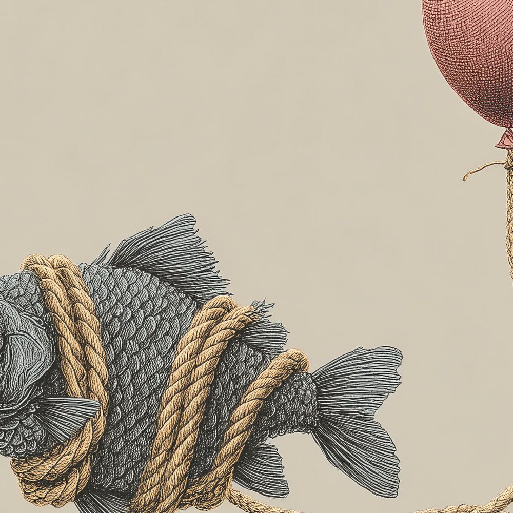 A fish, securely tied to a balloon, wants to go up. The image is absurd, funny and yet somewhere hopeful: against the current, with style.