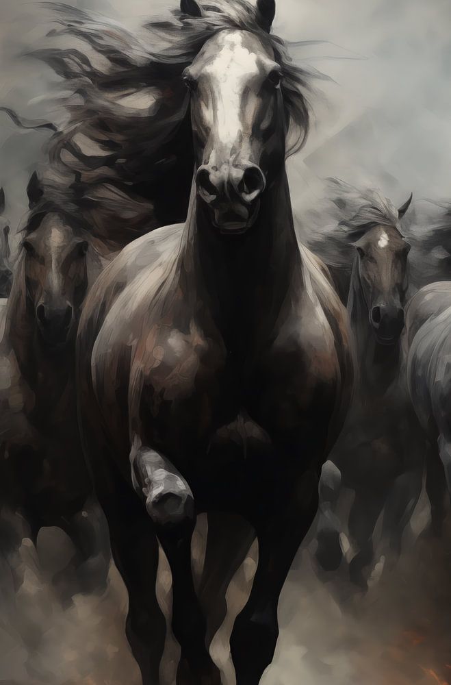 "Urban Echo's: Flight through Forgotten Streets" brings to life a story of contrasts, with horses galloping like phantoms through an abandoned urbane landscape. Drenched in a palette of grey tones and smoky umber, this digital painting evokes a sense of urgency and movement, while also evoking an atmospheric stillness. Embodying light and strength, the horses make their way through the ruins, and their untamed presence is at odds with the desolate stillness of the surroundings. In an interior setting, this impressive work would have a powerful visual impact, and it could trigger a poignant dialogue about the presence of the wild and natural in modern, sometimes forgotten urban spaces.