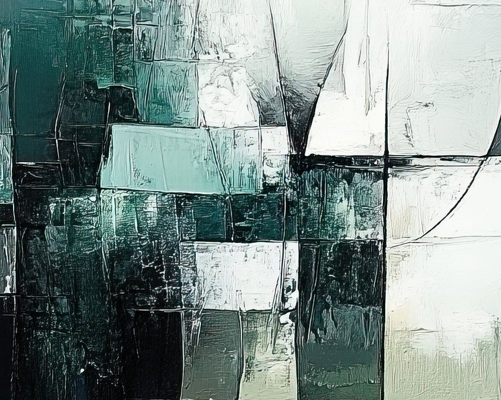 Urban Maze - This abstract painting shows a harmony of geometric shapes in shades of green, grey and white, suggesting depth and play of light.
