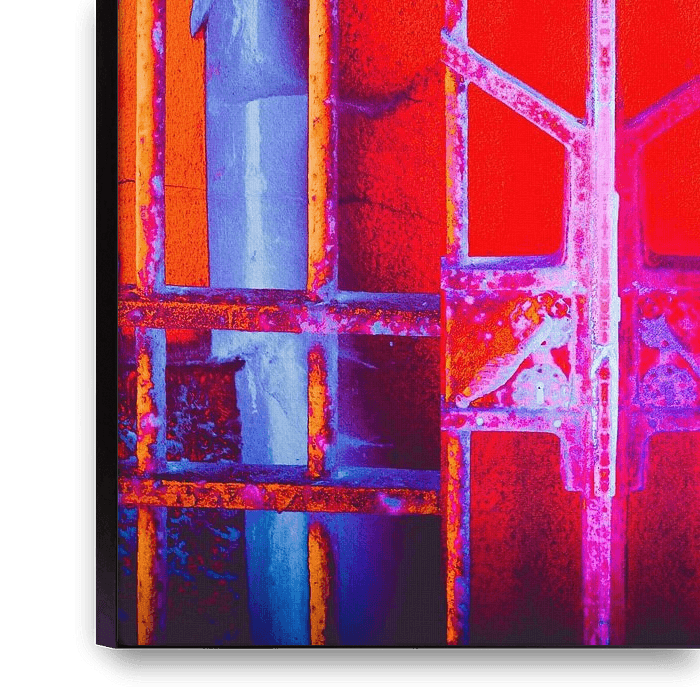 Enter the fascinating world of "Urban Mystery," an immersive photograph that captures the raw beauty of urban neglect and transforms it into an explosion of colour. This artwork is a visual spectacle, dominated by intense red-orange hues that contrast with surprising touches of deep blue, purple and yellow.