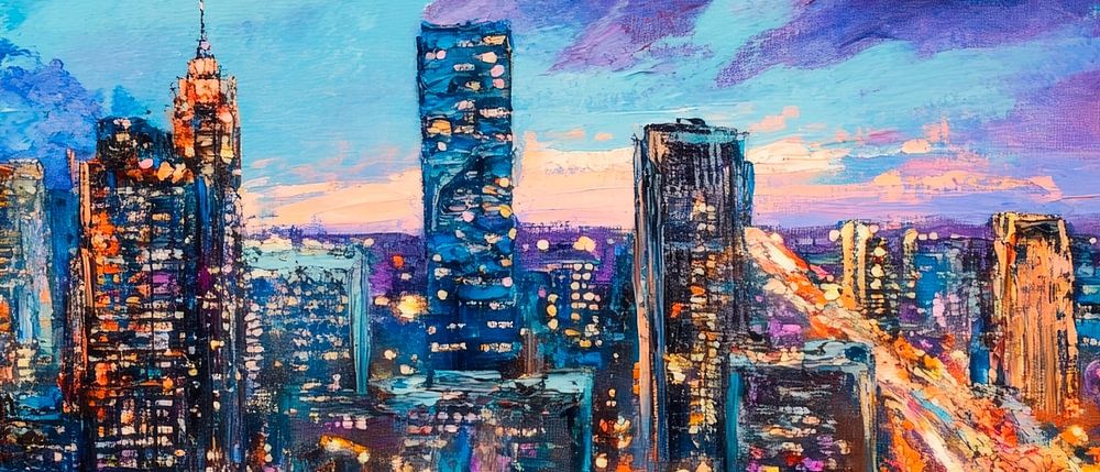 An urban masterpiece that captures the pulsating energy of a city at dusk. The radiant lights of the skyscrapers merge with the intense blue and violet of the sky. This vibrant depiction is perfect for a living room that invites you to relax and dream. An eye-catcher that stimulates conversation!