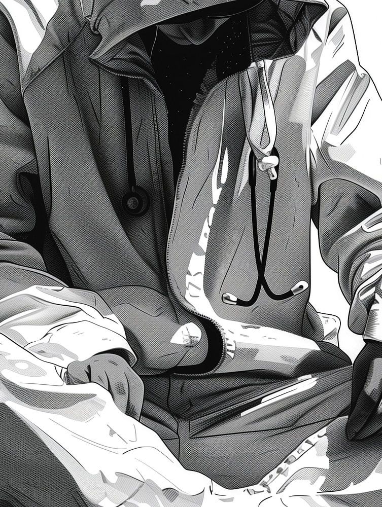 Black and white digital pen illustration of an urban nurse wearing streetwear sitting on the ground with his head down, in the style of black ink pen on a pure white background, with high contrast, hyper realistic detail at a high resolution and definition.