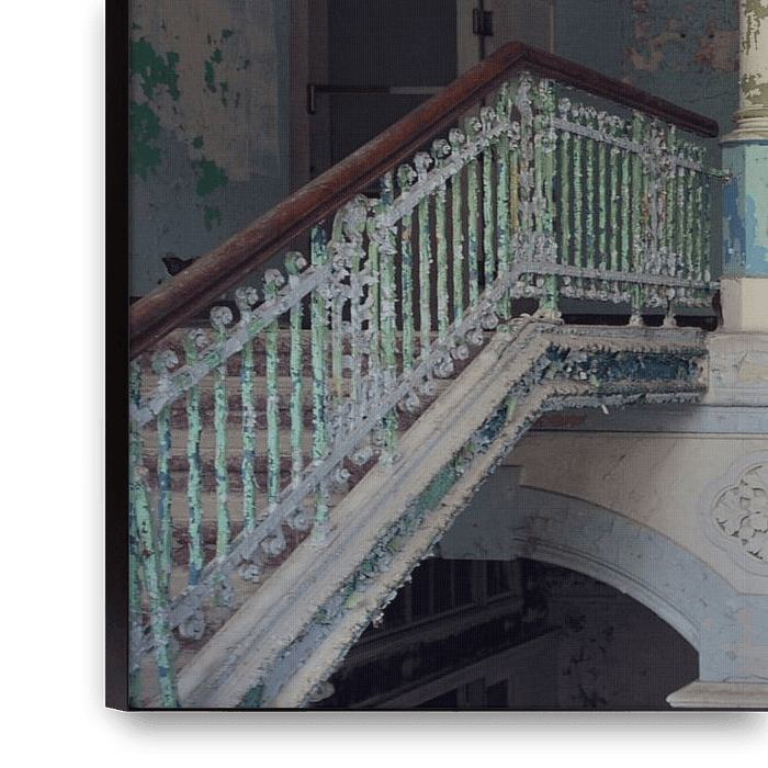 Een vervalen en verlaten trappenhal - balkon in een sanatorium.