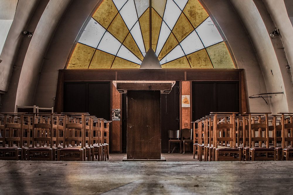 Beautiful abandoned chapel in Belgium. Superb stained-glass reflection.