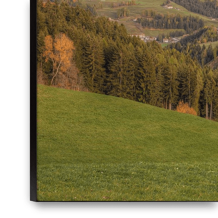 View into the autumnal Val di Funes with the mighty Geisler Group in the background, bathed in a warm light by the setting sun.