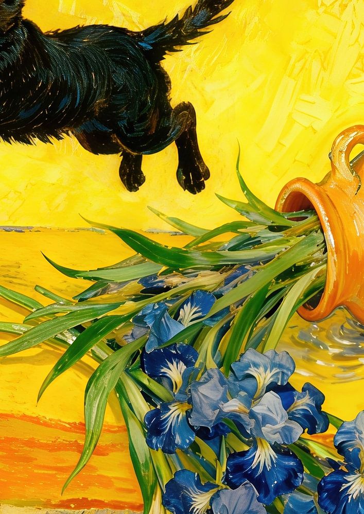 A lively and humorous twist on Vincent van Gogh’s classic style — featuring a mischievous black cat mid-leap, knocking over a vase of blue irises. Set against a bright yellow background and thick painterly textures, this artwork blends fine art with feline comedy. Perfect for cat lovers, art enthusiasts, and anyone who enjoys a modern, lighthearted spin on a timeless masterpiece.