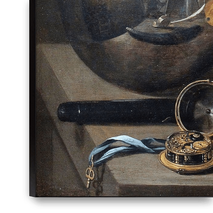 Various objects lie on the tabletop of a wooden table protruding diagonally into the picture against a dark background. The reflection in the glass ball shows the painter's room in which he sits in front of his easel. In the middle of the picture, there is a Flemish violin with a frog's bow on a pile of books because of the double edge inlay. To the right of it are a skull and a fallen Roman with a burled shaft, next to it a broken walnut. Behind the musical instrument there is an oil lamp, in front on the left there is a clock with percussion. An inkwell, a nib and a leather case are grouped around it. The key of the clock and the writing utensils tower above the edge of the table.