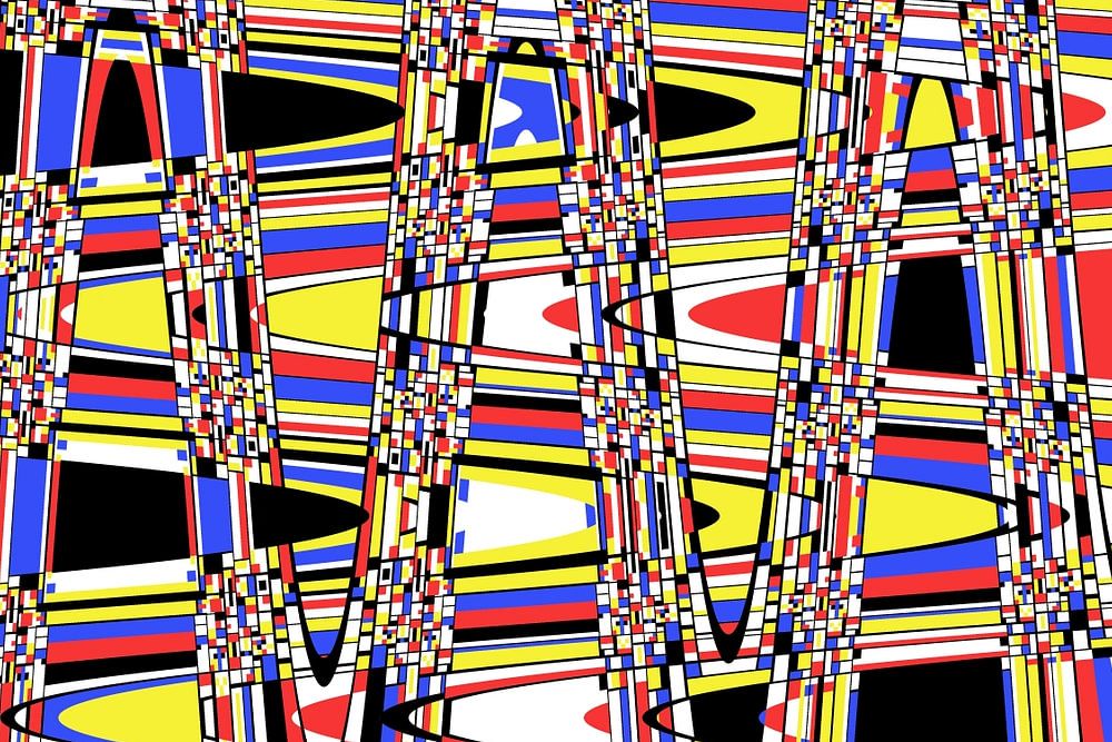 A digitally edited work in Mondrian style. Everything is digitally created so it is not painting!