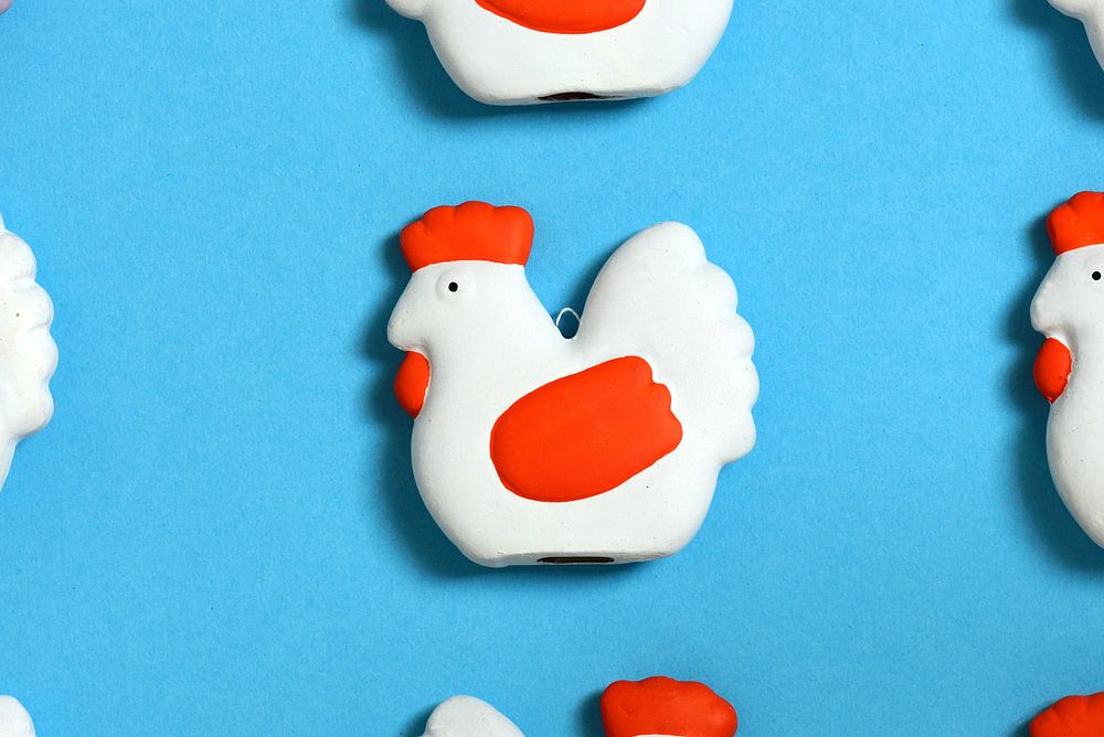 Various figures of chickens in front of a blue background by Ulrike Leone