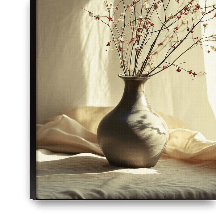Buy this flower art Vase with dried branches in sunlight by Kaiori Oldenburg on canvas, ArtFrame, poster and wallpaper, printed on demand in high quality.