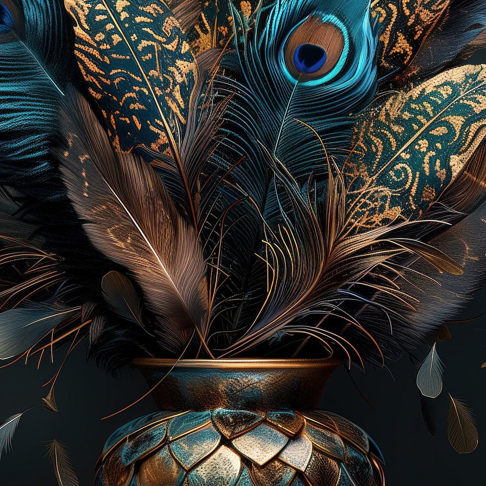Enrich your interior with this beautiful still life of an exclusive vase filled with exotic feathers and plumes! This piece adds a touch of sophistication to any room.