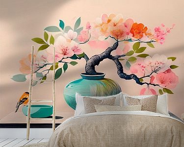About "Vase with flowers with bird on bowl, Modern painting in Japandi style"