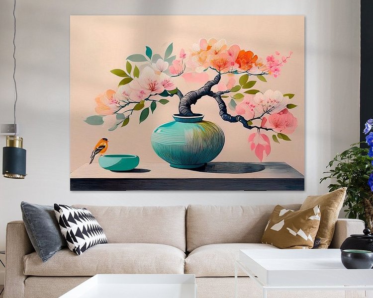 Buy this still life Vase with flowers with bird on bowl, Modern painting in Japandi style by Studio Pieternel on canvas, ArtFrame, poster and wallpaper, printed on demand in high quality