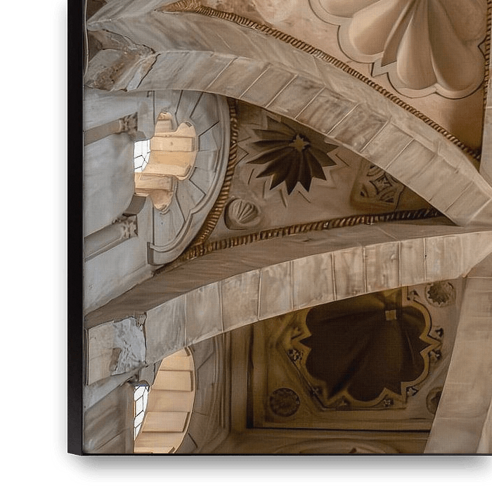 The picture shown here presents the artistically designed vaulted ceiling of the cathedral of the great mosque of Córdoba, an impressive example of the fusion of Islamic and Christian architecture in Andalusia. The focus is on the complex ornamental patterns and the refined stone carving, which spread symmetrically across the vault in a…
