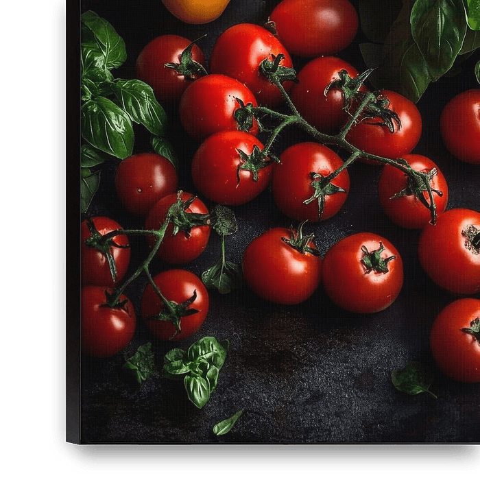 The juicy red tomatoes and the vibrant yellow of the peppers, framed by aromatic basil, shine in a fresh play of colours. This vibrant composition brings a touch of nature and flavour to any kitchen, ideal for awakening the anticipation of delicious dishes and creating an inviting atmosphere.