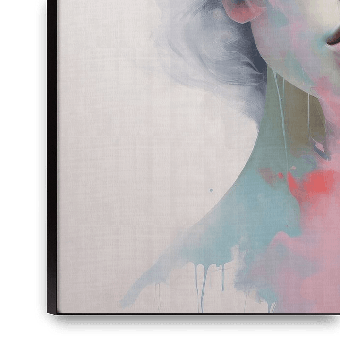 "Veil of Dreams" is an intriguing work of art that embodies the ethereal nature of dreams and the ephemerality of beauty. The female portrait, with eyes closed and a soft expression, seems to sink into a haze of pink and white smoke, symbolic of the mysterious world of dreams. The paint droplets that seem to drip off the…