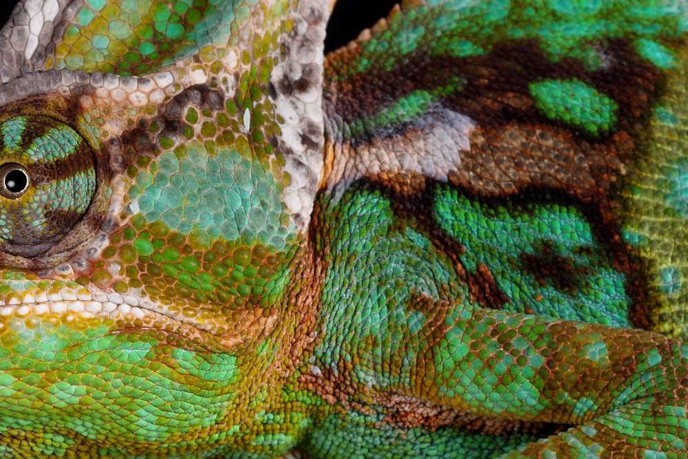 A portrait of a Veiled chameleon. These reptiles are masters of camouflage and can take on almost any color.
