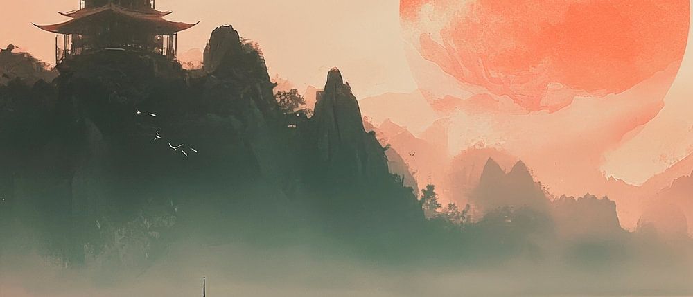 A mystical panorama unfolds, in which a lone rower paddles silhouetted against a bright orange sun. Pandanic mountains and a distant, majestic temple building frame the scene and create a peaceful, meditative atmosphere. This work of art is perfect for the bedroom to encourage dreamy thoughts and relaxation.