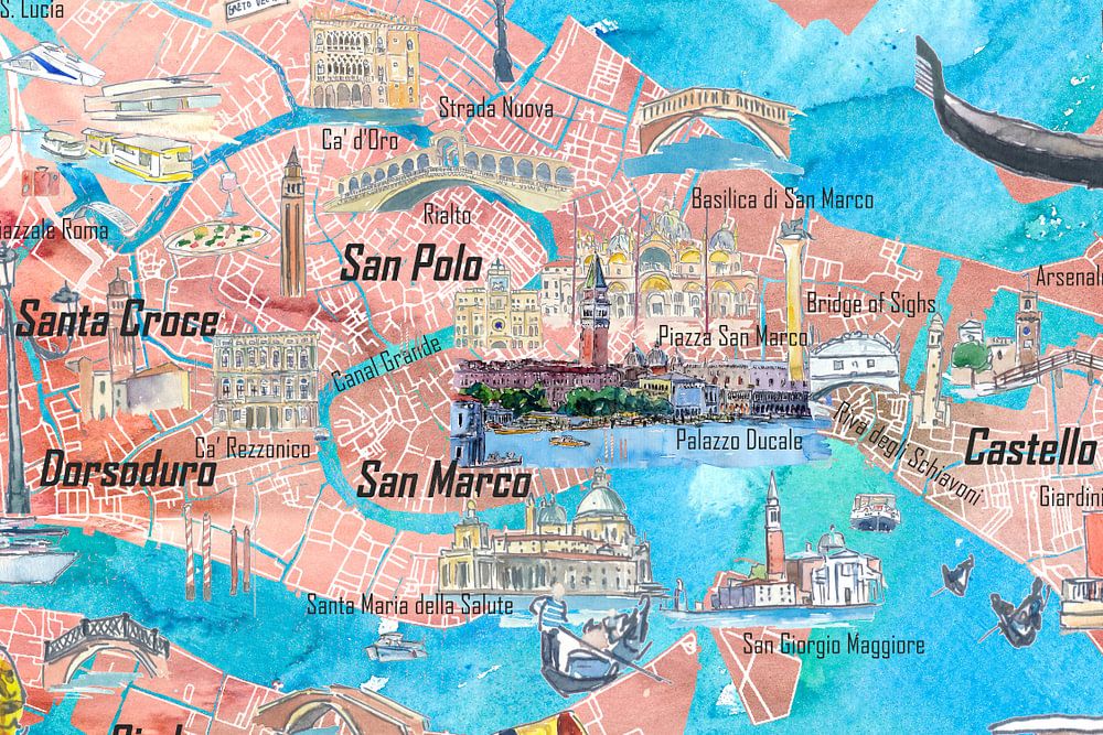 Venice Italy Illustrated Map with Main Canals Landmarks and Highlights by Markus Bleichner