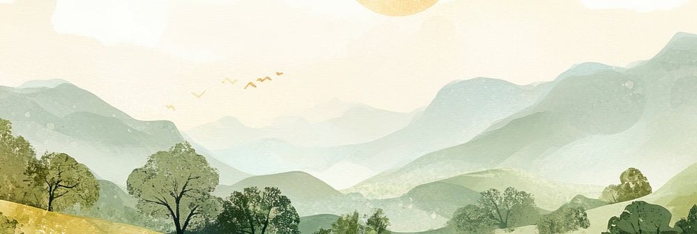 Details: landscape painting, abstract painting, rolling hills, stylised trees, soft colours, green hills, yellow tones, modern art, nature art, sunset image