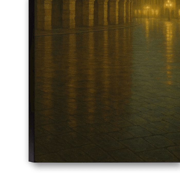 The work radiates stillness and reflection. Every light shimmers across the wet pavement, echoing the quiet poetry of empty spaces after rain. Influenced by the emotional realism of early 20th-century painting, it transforms architecture into introspection — the contrast of human fragility and eternal stone.
