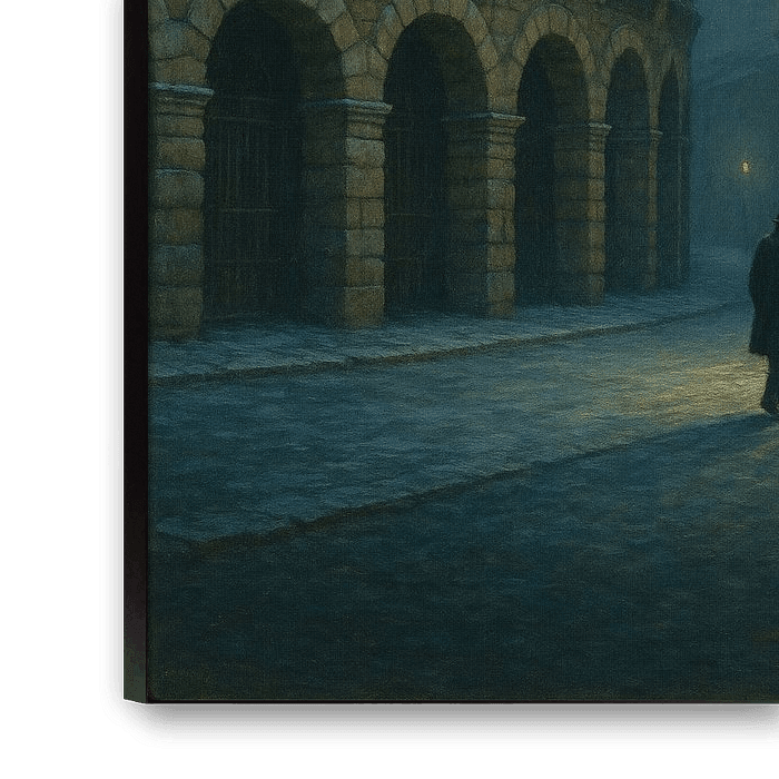 A lone figure walks past the Roman amphitheater of Verona — coat dark, steps slow, illuminated by a single lamppost. Verona by Night is a meditation on history and solitude, inspired by the quiet humanism of Edward Hopper’s cinematic realism.