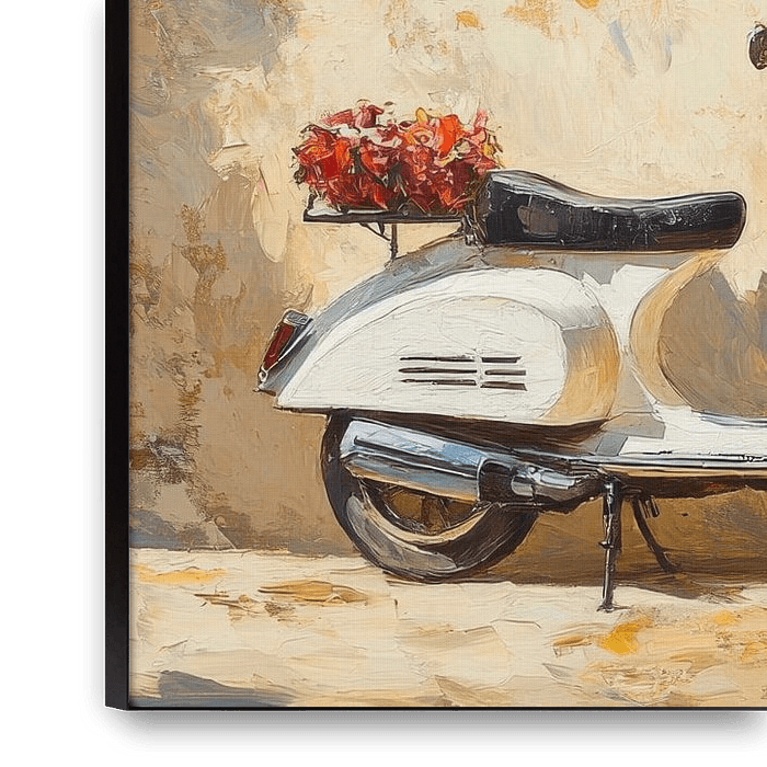A timeless scene in which a charming Vespa with colourful flowers in its luggage is parked in front of a sun-drenched wall. The green shutters tell stories of summer nights and Mediterranean serenity, while the flowering plants bring life and freshness to the picture. An inviting view of an idyllic setting that invites you to linger.