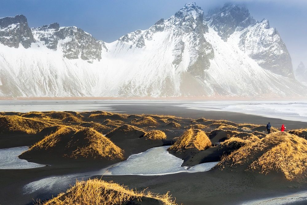 The wintry sight of the Arctic Vestrahorn Mountains in Iceland is a breathtaking reminder of nature's unbridled beauty. It is a place where solitude allows for a deep connection to the world and to oneself, where the roaring sea and majestic mountains remind us how sublime and untouched nature can be.