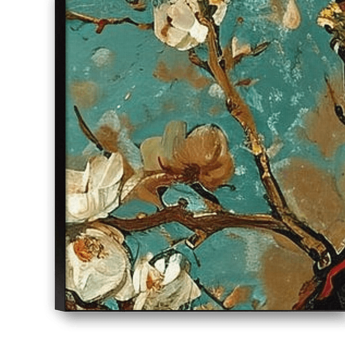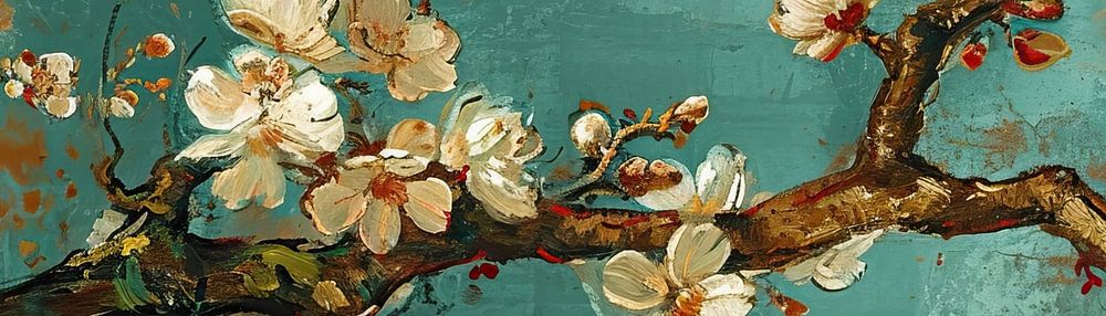 Vibrant Blossom Branches | Blossom Art Painting - Here you see an alluring play of blossoming branches on a soothing petrol background, accented with warm earth tones and hints of soft white. Expressive brushstrokes lend a dynamic, almost tangible vibrancy to the blossoms, while subtle red accents offer surprising depth to the whole. The piece exudes an organic elegance that blends seamlessly with a variety of interior styles, from classic to country.
