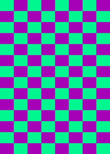 A bold checkerboard pattern featuring alternating squares of bright turquoise and violet. This energetic design is perfect for backgrounds, textiles, or pop-art inspired projects.
