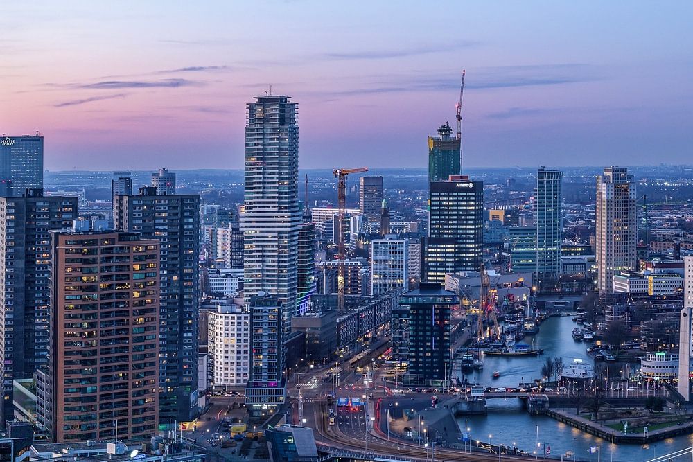 Beautiful photo of nighttime Rotterdam, with the lights in view, the flats the offices, the Erasmus burg, the street lights.
