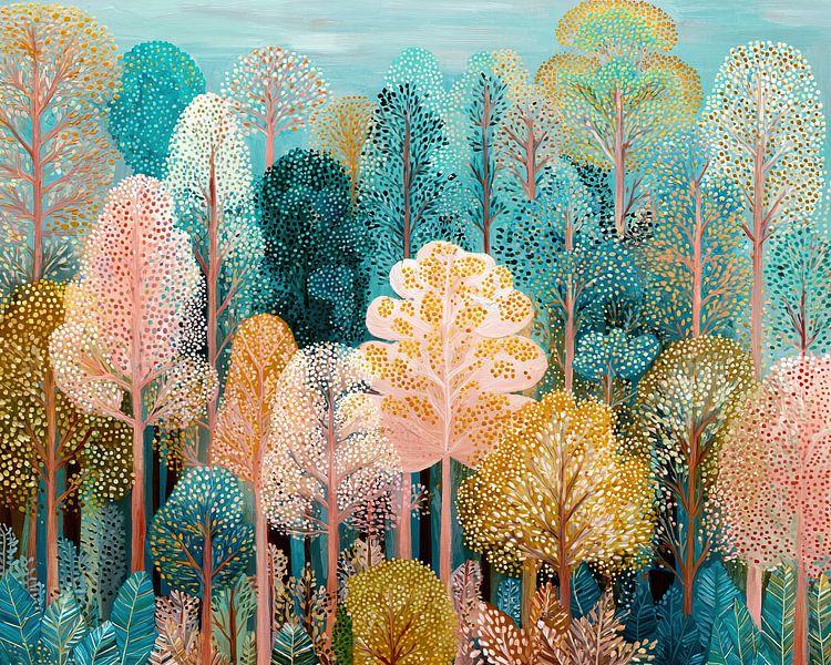 Details: trees, nature, cheerful, painting, colours, mint green, gold, green, pink,…
