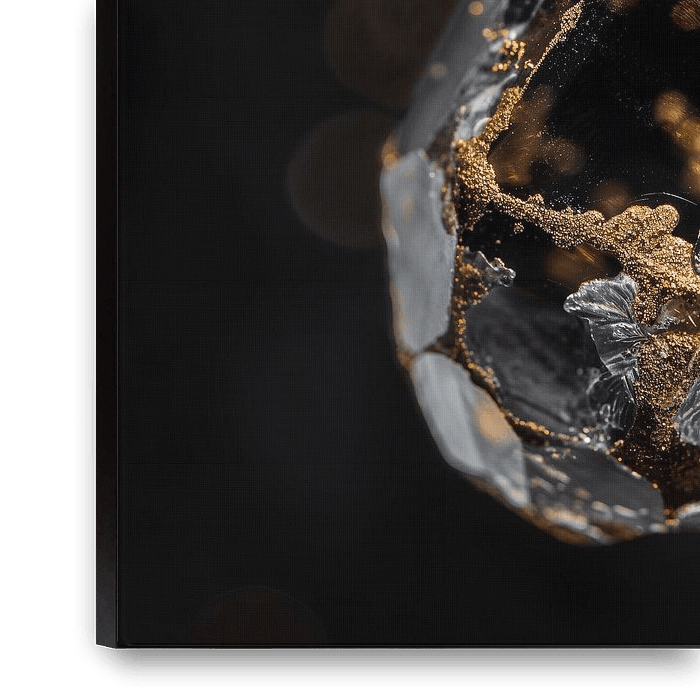 Vibrant Whispers 2 brings the mysterious hues of black, transparent gemstones to life against a dramatic background, creating a sense of depth and mysticism. Gold accents contrast beautifully with the dark gemstones and flow through the artwork like liquid light, creating a captivating play of light and shadow. Sparkling reflections…