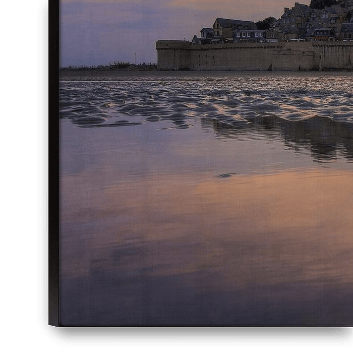 Beautiful shot of medieval monument historique Le Mont Saint-Michel in Brittany, France, during sunset from the mudflats during low tide with reflection in the water