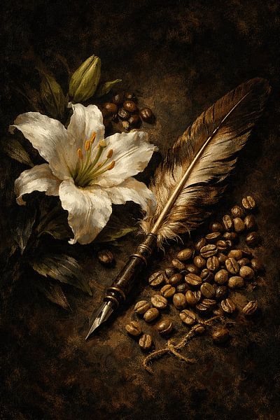 This artwork presents a moody Victorian-inspired still life that blends symbolism, literature, and quiet emotion. A delicate white lily rests against a dark, textured background, representing purity, devotion, and the timeless essence of motherhood. Scattered coffee beans evoke ritual, warmth, and moments of contemplation, while the…