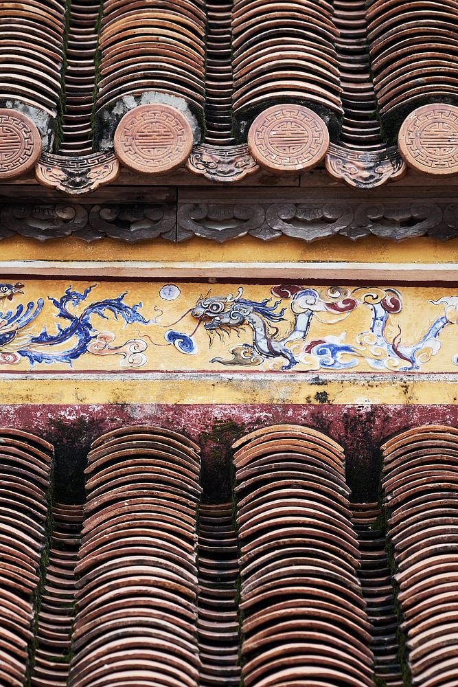 Vietnamese roof decoration in Hue. Beautifully decorated Vietnamese roof. Roof tiles and wall painting on roof
