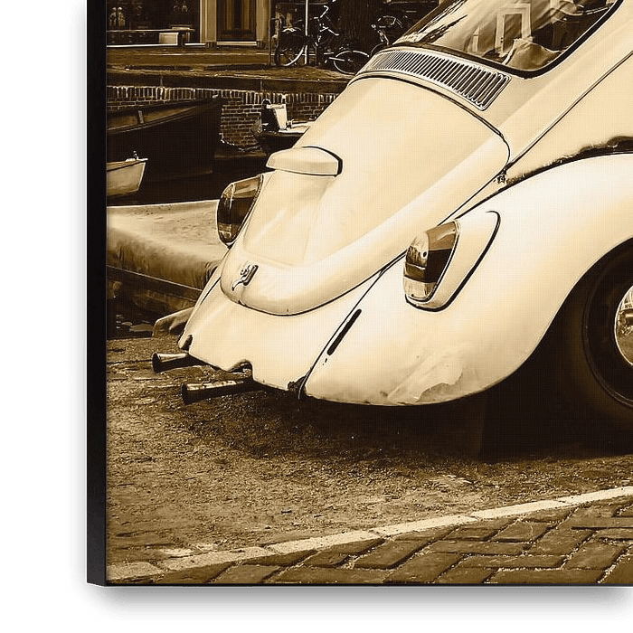 View at an old canal in Amsterdam with a classic Volkswagen Beetle in front