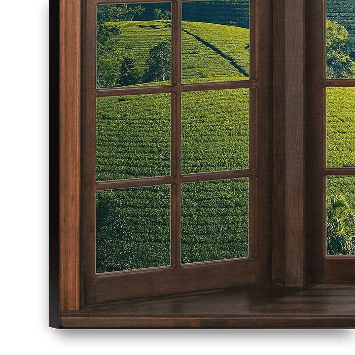 A beautiful view from a wooden window in a stunning 3D image. A real eye-catcher for your wall that makes it look like you are looking right outside.