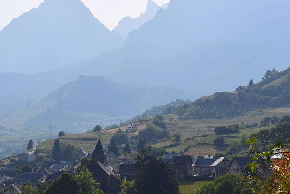 About "View of Lescun, remote village in the Pyrenees, with rugged mountain range in the background"
