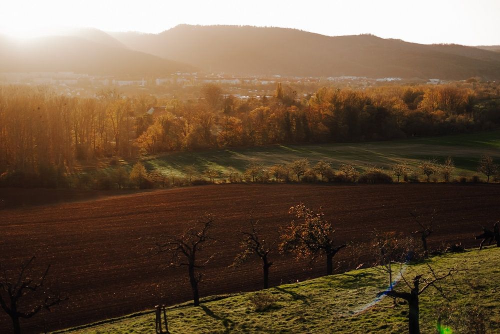 View at sunset of the Bode Valley in the Harz Mountains in autumn. Warm light falling on the landscape and gladdening the heart.