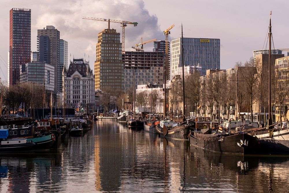 About "View of the old part of the oudehaven with boats in the morning in Rotterdam, the Netherlands"